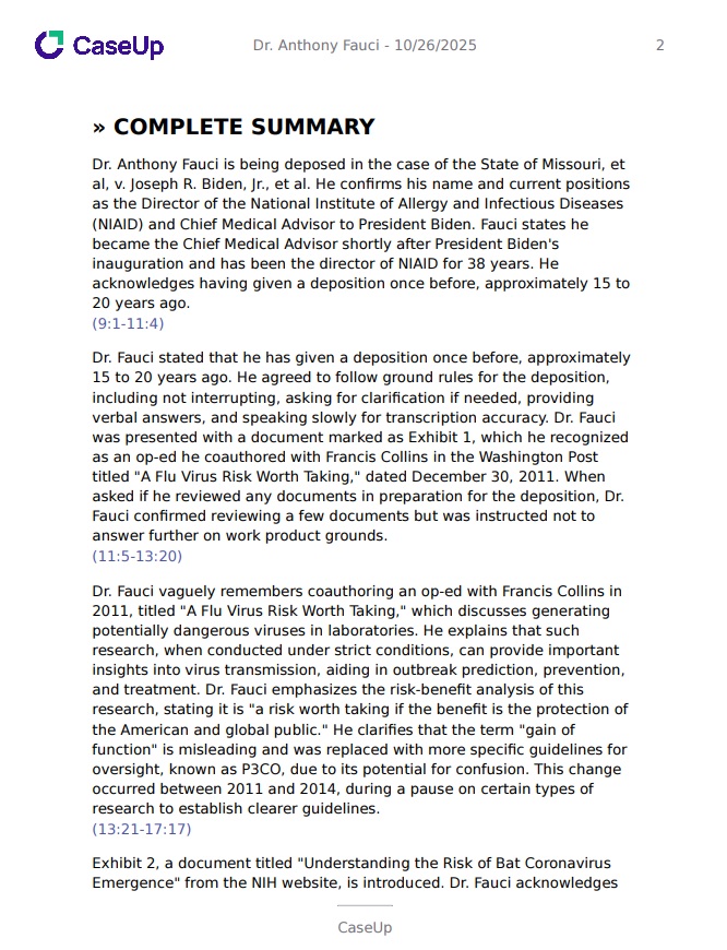 Generate polished, easy-to-share PDF summaries, complete with appended deposition transcripts.