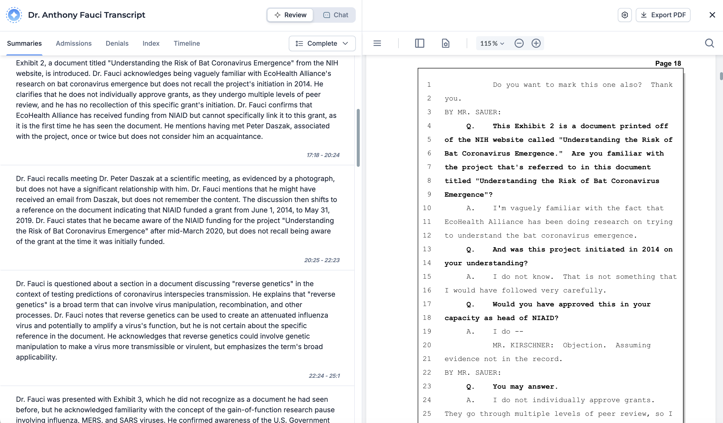 Build a detailed, searchable index of testimony topics, with polished, shareable PDF summaries and appended transcripts.